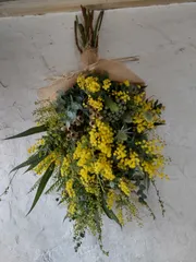 ミモザスワッグ またまたこんばんはー✨ぷりぶりです🤭毎年恒例、お気に入りのお花屋さんでミモザのWSが開催されております。まずはこちらのミモザスワッグ。モリモリのミモザと他の花材達。よろしくね(๑•̀ㅂ•́)و✧ユーカリの実。昔、製菓材料でミモザの砂糖漬けがあったけど、生産終了しちゃったのよね。スワッグは逆さに吊るす