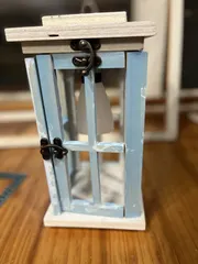 また木製ランタンを作ってみました。 今回は夏らしい色合いの、ホワイト×アイスブルーです。 前回からの改良点としては、・内側を白で塗装・上蓋に蝶番だけでなく、留め具を付けた・上蓋にホールソーで穴を開けて、100均で購入したソーラーライトを付けたとなります。 今回は近くのホ
