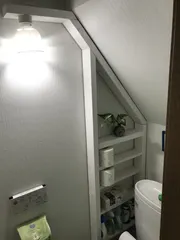 トイレの隙間収納(人感センサー電球付き) ■材料 ホワイトウッド (3.8×9.0 と 2.0×9.0)■工夫したポイント 天井の既設電球は口径が合わなかったので、腕を伸ばして26口径の人感センサー電球を付けたこと。材木を天井の角度に合わせてカットすること。花瓶が置けるデザイン。棚板は外せる。