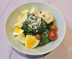 茹で立てのブロッコリーと茹で卵に、物産展で購入した瓶入りのタルタルソースをのせて、粉チーズとピンクペッパーをトッピングしました♪自家栽培のミニトマトも添えてみました😋♪