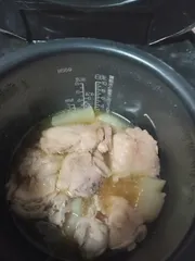 第26弾塩とかつお出汁のと鶏だいこん ■材料かつお出汁顆粒80グラム、白だしかつお液大さじ2、鶏肉2枚、大根半分、水400cc■作り方鶏肉2枚を半分に切る。大根1.5センチの暑さで切り皮を剥き半分しておく。大根入れて鶏肉ん載せて、残りの調味料を入れて炊飯器でたく ■工夫ポイント①大根を下に敷くことで鶏肉が焦げない。②炊飯器なの