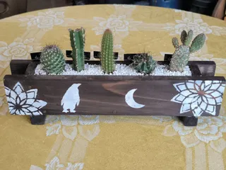 横長 プランターとサボテンの寄せ植え いい感じに 寄せ植えできましたステンシルは難しいなあ 特に小さなスペースにすると浮いてきてしまって にじみますサボテンは小さめなものを選んで 5個 配置しました