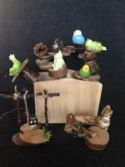 木の端材と100均で! バックが暗くて見にくいですが^^;上三つはガーデンスティック用に棒つけました!が木がなかなか重たいから〜浮くかは微妙です🤣笑