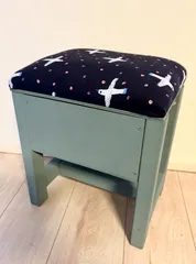 収納付きスツール 娘と一緒に収納付きスツールのWSに参加させていただきました‼️ 生地は持参させていただいて、カラーは娘チョイスでした!母は茶色系推しでしたが、娘は青系1択でした。笑 可愛く出来て満足です‼️