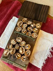 シジュウカラへのプレゼント 朝から雨が降ったりやんだりなので、家の中で出来る工作的なことをしました。昨年の秋にリースの飾りにしようと拾ったクルミ。結局使わなかったのでシジュウカラにプレゼントすることにしました。バーナーで焼いて焼杉にした端材を2枚使います。園芸用の柔らかいワイヤーをねじって止まり木の代わりにしました。いい雰囲気