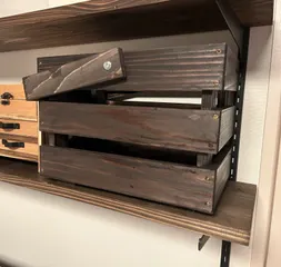 以前自作のアンティーク収納棚とワークショップ作品作業台収納とスモールボックスをコラボしてみました先日ワークショップで作った作品もおさまりました✨小島田店ストアオリジナルの1個を椅子代わりでも開いたところに鏡つけたらドレッサーになりますね✨本庄早稲田店にてストアオリジナルアンティークキャビネット作りま