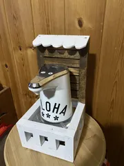 今更だけど、昨日購入した手指自動消毒器。転写シールでお馴染みのALOHAを貼り付けて完成予定でしたが、今日は限定投稿日💦木材を丸鋸でカットして、何だか😅まぁ、ここまでは…おかしくなってきて😅何をしたいのか分からなくなって来ました😨屋根を糸鋸で切り、彫刻刀で溝を彫り色を塗って、更に微妙になりました。笑