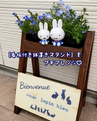 みなさんされてるアレンジですが、私的に頑張ったので、投稿させていただきます😅ワークショップでできたのはここまで↓看板付き鉢置きスタンド 看板は裏面にもステンシルして、全体に"汚し"を入れました。前面にも背面上段にも看板を移動できるようにしたかったので…前脚にフックを上下で向かい合うように、