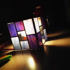 ステンドグラスで ステンドグラスで小物を作りました。ステンドグラスのきれいなガラスが大好きです。 キャンドルホルダー 月と猫のオーナメント テンセグリティー コースター何とも言えない透き通った色とガラスの質感切り方によって1枚1枚に違った模様が現れるのも素敵です木とステンドグラ