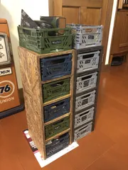 100均の折りたたみコンテナを積み上げて使っていると、下の段が取りにくい‼️と言うことで、端材を使って引き出し式にしてみました。結構使いやすいです😄