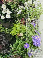 段々毎日の気温が上がってきたっ東京ぐーーんと草花が成長して来ました100均の網を使って作ったパーゴラ上から見たら 笑える😂何とも安っぽい😓笑える安っぽちさだけどクレマチスがちゃんと絡んで花が咲いてくれてる😊かっこいいパーゴラ作れるようになりたいわ〜 春に花が殆ど終わってヒューケラが素敵な