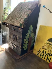 家にある端材やデッドストック、100均の材料で作りました。壁材が薄いベニヤなので、土台に取り付けるための木片を木の幹風にアレンジしました。屋根は木の皮、把手はマグネット傘立てを分解した際に出たパーツの再利用です。屋根内側に鏡を取り付けてコスメボックスに😉 薬箱やDIY用のパーツ入れにも⭕️