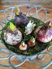 ヒヤシンスは3色選びましたが、ポットから出して土を落としているうちに何色か分からなくなったり、ヒヤシンスがぎゅうぎゅう(根っこが立派で)で器に収めるのに苦戦しましたが、素敵な寄せ植え出来ました💕球根の寄せ植えは初めて🔰勉強になりました🎵