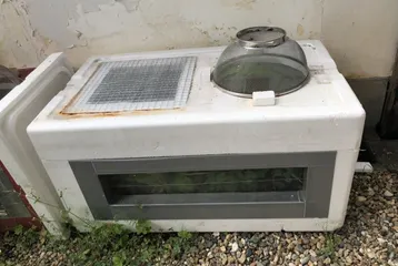 トロ箱を改造したスズムシの飼育箱です。数年前に作って外に置きっぱなので、ちょっと汚いです。すみません💦底に水抜きの穴をいくつか開け、土を5cmくらい入れ、側面を適当にカッターで切り抜いて網戸の網をダクトテープで止め、上面も適当に切り抜いて100均のザルを伏せだだけです。でもトロ箱の断熱性は神!夏の直