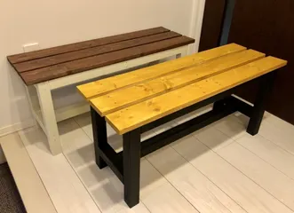 ありがとうキャンペーン 木製ロングベンチです。奥にある方が一台目。もったいなくて外に出せず玄関に置いています。そして、長男が欲しいと言うので二台目を作りました。座面はパイン、脚部はブラックにして男前な感じにしてみました。作ってみるとなんだかニ台目の方がよく見えてきてあげちゃうのが惜しい…😅お正月に帰って来た時になんて言うか