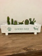 横長プランターとサボテンの寄せ植え🌵 今日はちょこっと遠征で、横長プランターとサボテン🌵の寄せ植え作り〜この作品、予約が出来なくてがっかりしていたのですが、開催間近で空きが出たようで、参加出来てラッキーでした♫サボテンは今まで育てた事が無く、選んだ5個のサボテンは見た目重視で選びましたが、どの子も可愛いです😊