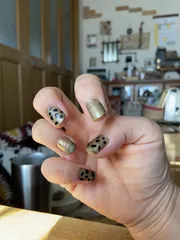 大好きなマットカーキをベースに3本にヒョウ柄シール😄、薬指は下にゴールド塗ってフレンチにしました〜🎶久々にうまくできたので見てやってください✨😆シワシワの手で申し訳ないですが💦、リングするとネイルは映えますよね❣️手作りコースターと一緒に📸✨✨