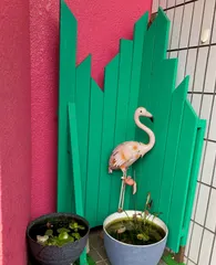 いつもワークショップで楽しませて頂いてます!玄関脇に、大好きなフラミンゴの置き物を置いたら映えなかったので、1×4材を使って背景的なついたてを作ってみました。初心者で、試行錯誤しましたが色も形も大満足!自画自賛ですねぇ。