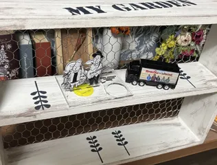 チキンネットでアンティーク風ディスプレイ棚 今日、もう日付が変わって昨日ですね、初めての店舗で作成の チキンネットでアンティーク風ディスプレイ棚時間があったので、欲張って棚にもステンシル🌿しました。 楽しい時間もあっという間に過ぎました^ ^オリジナル作品の多い素敵な店舗でした。また参加できたら嬉しいです^ ^