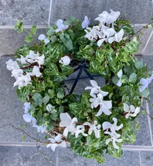 ■作品内容シクラメンのリース■工夫ポイントホワイトクリスマスっぽくしたいけど、お気に入りのビオラがよくて、ちょっとブルー🩵■使用した商品リングリースシクラメンビオラバコパワイヤープランツ