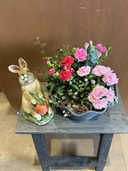 母の日寄せ植え教室フレアーカップ 名古屋みなと店にてカーネーション3種(いちご,ローズ、さくら)とユーカリ,ワイヤープランツをバランス良く植え込みました。プレゼント🎁にしようと思ったけど可愛いくて手放せない❣️
