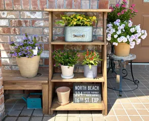 我が家の玄関先 ■作品内容ワークショップ作品とコラボさせた玄関先の花たちです☺️ ■こだわりポイント以前ワークショップで作った足場風3段ラックとミニベンチを並べてみました。わたしなりのこだわりは、どんな色の花やどんな形のプランターを並べたらこのコーナーに合うかを写真に撮って試行錯誤してみることです。花苗を