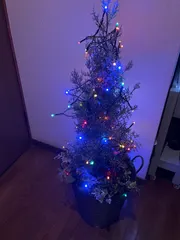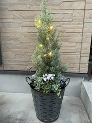 冬のシンボルツリーの寄せ植え 先月GreenWSで作ってきた『冬のシンボルツリーの寄せ植え』 私のコニファーはブルーアイス、ガーデンシクラメンは赤を選びました。他にビオラ、アイビー、白妙で周りを寄せ植えしました。電球2種類と★星のピック付きブリキ?の鉢カバーが予想以上に大きくて立派な寄せ植えでした。❤️ 家に