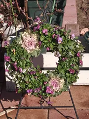 ビオラのリングリース 春の水やりが大変なのはわかっているけど今年も作ってしまったリングリース全部一株98円の苗で作り、3週間位経ちました😊ん~~もっと別の色を入れればよかったし、リーフも使えばよかったと植えてから気づく😅腕がないから金額抑えようとすると見栄えが上がらない😥来年は動きのあるリースに挑戦だ〜🙋
