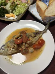 鯵のアクアパッサ風 小ぶりな鯵半枚におろすのは😅大変なのでアクアパッサ風にしてみました💘おしゃれにパンとワインで🍷