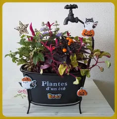 NEW 旬の寄せ植え🌿💮 ■作品内容【厳選!旬の寄せ植え】を教えて頂きました。7種類の植物を植えましたが、私には、高度でバランスが難しかったです😅■こだわりポイント・ハロウィンにぴったりなゴシキトウガラシが入っているので、100均で見付けた、塩ビステッカーにマグネットを付けて、飾りにしました。(ほんとは ピックを自作したかっ