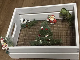 ■作品内容ホルソーでベジタブルボックス作ったばかりなのでまだ何を入れるのかも考え中😊家にあるミニチュアとスワッグの残りのモミノ木の葉でツリー🌲置いてみました。