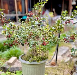 クリスマスホーリーが色付いてきました 5年くらい前、ご近所さんの庭に鉢ごと横倒しになったまま実を付けてたクリスマスホーリー。元の持ち主様から、自分は脚を悪くして歩くのさえ困難だからもし良かったらもらってくれないか?と申し出があり、当時欲しいなと思ってたので喜んで頂いてきました。とりあえず鉢増しして紐かけて引っ張ったりして3年かけて真っ直