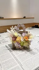 年始早々市内のパン屋さんから《ウッドショッパーズアレンジ》(パンまたはスイーツ、ドリンク付)のお知らせがきたのでカインズ仲良しさんをお誘いしてWSに行ってきました。 私はプリザーブドフラワー?ドライフラワーの花材でアレンジするWS参加は初めてでしたが仲良し3人で(実際参加は5人)心強くて?