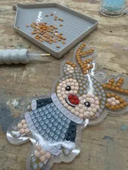 ダイヤモンドビーズ タイニーサインボードをしてた時に午後から工作教室でダイヤモンドビーズの見本を見せてもらってかわいかったので午後からトナカイと雪だるまを作りました アルファベットが書いてあるところに指定の色のビーズを置いていくアートで道具一式ついていてお安い😳かわいい😆次は雪だるますごくビーズが余ったのでア
