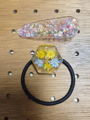 レジンでヘアアクセサリー レジンでヘアアクセサリーを2種類作ってきました。初レジン作品をワークショップで体験できて良かったです。ヘアゴムの方は、青と黄のお花が見えるように作りました😊もう一つの髪留めの方は、ピンクの花材を入れてます。どちらも可愛く出来たので早速使いたいと思ってます💞また来週も作りに行きます‼️