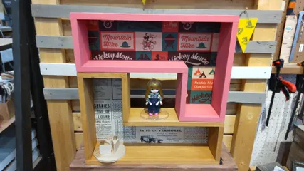 L型シェルフ 今日は、午前、午後とL型シェルフを作って来ました🙌午前中は、マイカラーを封印して笑😁壁紙もオシャレな英字新聞風のを貼りました🙌午後は、店舗隣のセリアに行ったら🐭のリメークシートを発見🙌WSのスタッフさん許可を貰い持ち込みで🐭さんの壁紙に😁色も持ち込みのベリーピンク🙌何も考えないで作ったので、2つを組