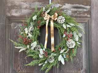 クリスマスリース ■作品内容 ユーカリ、シダーローズを使ったクリスマスリース■工夫ポイント ユーカリとシダーローズをペイントしました※以下カインズクリスマス部門のみ入力■使用した商品アクリルスプレー(油性)