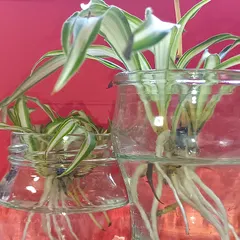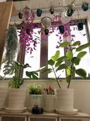 窓辺にトラディスカンティアを吊るしているので、窓辺がとても華やかに💕水で濡らすと更に鮮やかになるのでとても綺麗です!またフィカスやモンステラの緑も相まって晴れの日にはトラディスカンティアの斑入りの部分がキラキラと光り、更に綺麗✨トラディスカンティアは購入時は一株でしたが3株まで増えました。これからも
