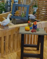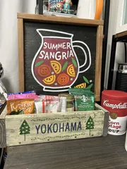 B&Bボックスとボードで 早速、このように活用。台は、実はミシン椅子です。 カップスープの粉末を入れてスープコーナーを作りました。 サインボードが夏バージョンなので、何か相応しいのが作れたら良いなぁ。