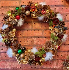 木の実てんこ盛りの大きなリース 羽毛とオーナメントボール以外は家の近所で拾った、ありとあらゆる木の実を付けましたけどそれでもなんか物足りない…。とりあえず飾って眺めて考えることにします