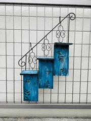 正面だけじゃなく横からも撮れば良かった😅数年前に300均で買ったラックが壊れてきたので廃棄の為、乗せていたブリキ鉢を外したら…折角のアイアン部分が勿体なく思いリメイクする事にしました😅フェンスにワイヤーでぶら下げて使うので100均の軽い木材を使用。段々の形にちょっと変形、ペイントして後は、何のグリー