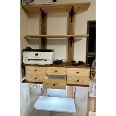 石膏ボード壁に棚&引き出し&折り畳みテーブル 石膏ボード壁に私のプチオフィス😁作りました。 DIYレシピ載せましたので良かったら見てください😊https://diy-square.cainz.com/announcements/c2jferwwpohqefee