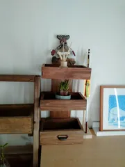 テーブルシェルフ3段 先程、イベントに参加してきました。今回は、テーブルシェルフ3段です。 玄関周りはウオルナット色で揃えたかったので作ってよかった😊統一感が出て良き😀 早速鍵入れにしました。 初めて釘を打つ作業をしました。最初悪戦苦闘😓 まっすぐ打てない…。けど慣れると楽しい❤️