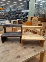 フラワースタンド 本日のWSは枠を2つ予約し『フラワースタンド』2個作成✌️外用と室内用に使う予定😄💕1個目の製作中、少しガタツキがあることをアドバイザーさんが、気がついて下さり「少しだから😅まっ!いいか」と思ったのですが「直すなら今だよ」の言葉でやり直すことに。その時、ここを外して合わせようと丁寧な説明と手助けして