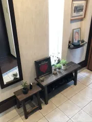 我が家の玄関での作品集 ロングベンチ、ミシン椅子、ミニサインボード、カボチャ型ミニを飾っています。