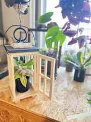 ランタンBOXのアレンジ 植物を入れたかったので、前開きにアレンジしてみました✨ 最初からその予定で作れば、もっと簡単にできたのでしょうが、いつもの如く、思いつきの突貫DIY⚒️やさーしく分解して、塗料を塗り直し。100均の蝶番で扉を開閉できるように た天面の蓋と格子をビスで固定 写真撮り忘れた