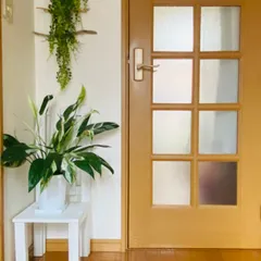 CAINZワークショップで作ったインテリアチェアに、存在感あるスパティフィラムを置いています。玄関を開けるとお出迎えしてくれます😊