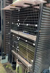 アライグマ攻防戦 カインズさんのデザインメッシュネット。このオシャレなネット、ホントはこんなもんに使うんじゃないよね( ᷄ᾥ ᷅ )。これを2枚縦に結束バンドで繋いでぶら下げて…ヒートンを4箇所に取り付けて。餌やり等で開ける時はこう⬇️閉める時はこう⬇️ さす