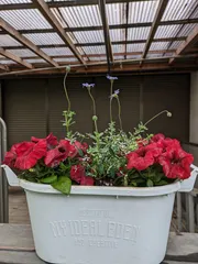 ペチュニアの寄せ植え💕 私も今日、ペチュニアの寄せ植えをして来ました。ペチュニアは、我が家の庭にたくさんあるのに😅赤と白が増えなくて🌀私は🔴を2つ植えました👍