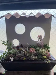 おうち型多肉プランター作ってきました❣️ カインズさんでお迎え🐬 それ以外はうちで増やした葉挿しっ子🩷で早速寄せ植えしました😊 夏越しがんばろ💪